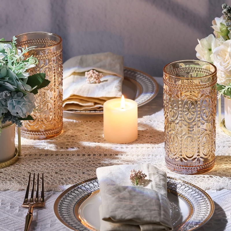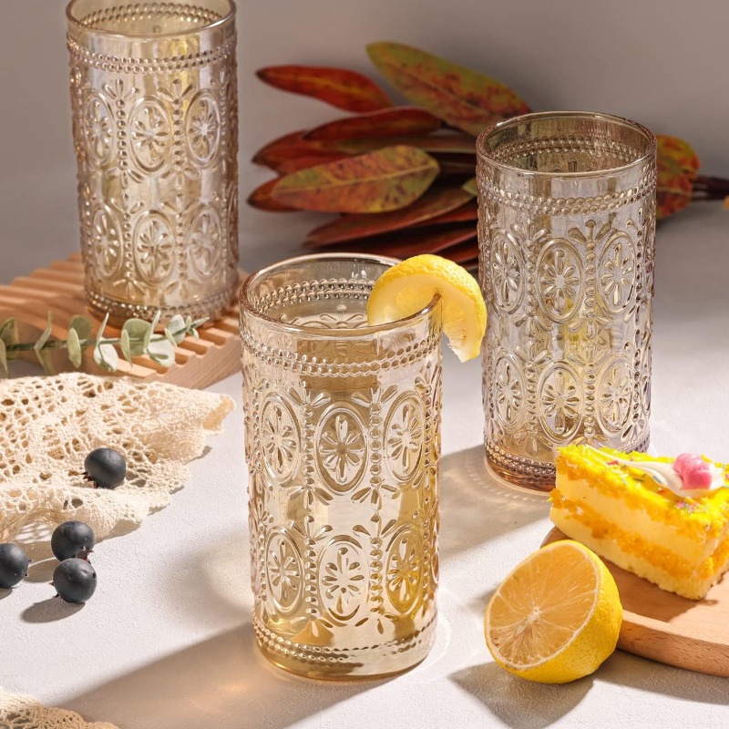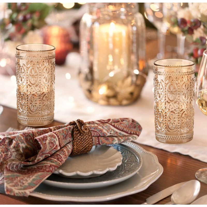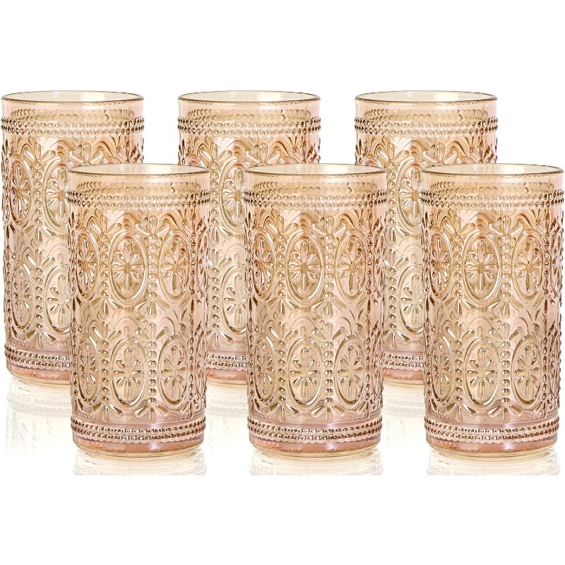 6 Pack Highball Beverage Glass Cup 12oz Amber Glassware Drinking Vintage Emed Drinking Glasses Old Fashioned Glass for Party Wedding Home Office and Gift