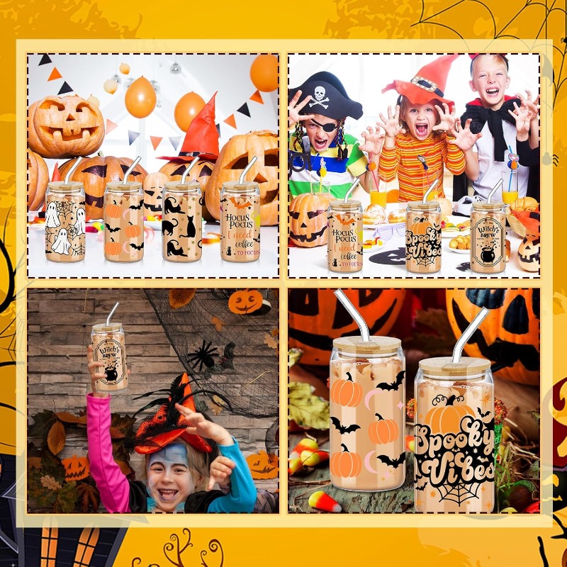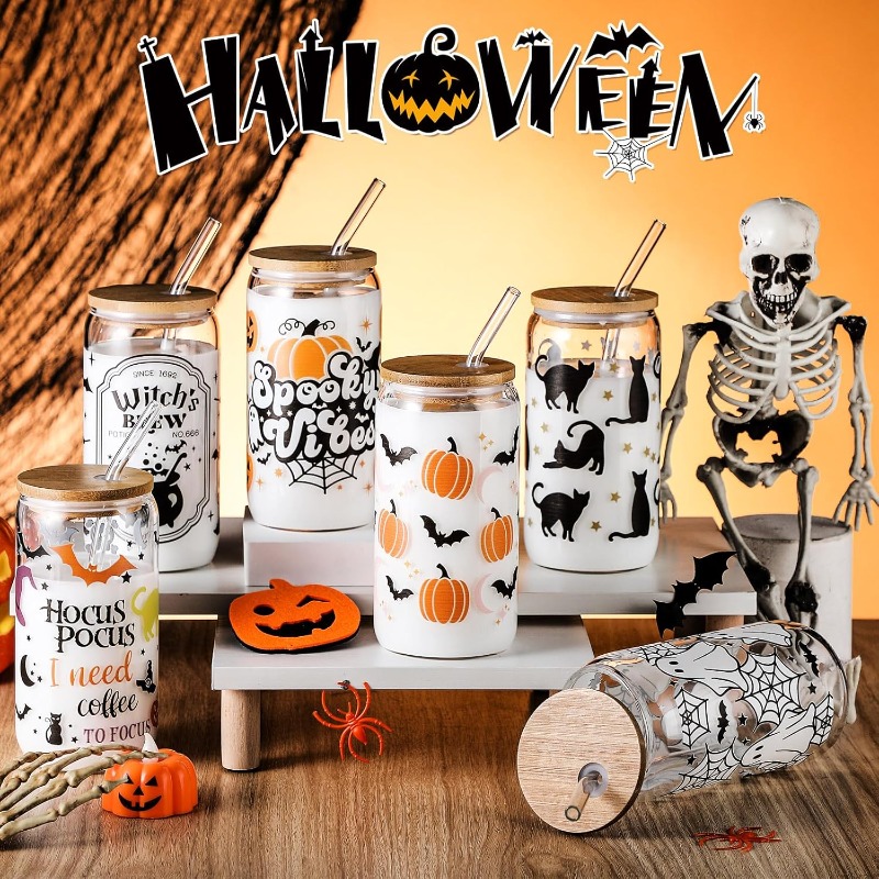 6 Pcs Halloween Drinking Glasses 16 oz Hearts Glass Cup with Bamboo Lid and Glass Straw Can Shaped Beer Glass Reusable Love Smoothie Cup for Women Teenager Valentine Party Birthday Gift