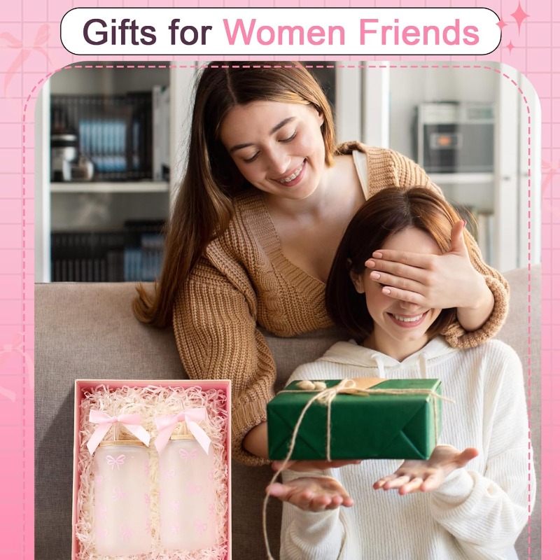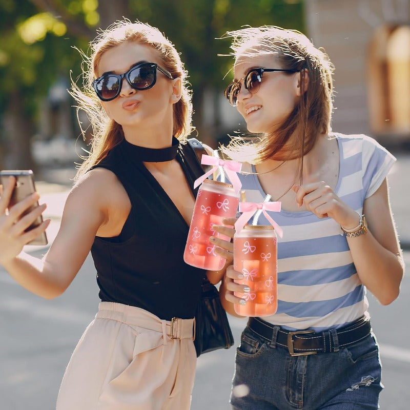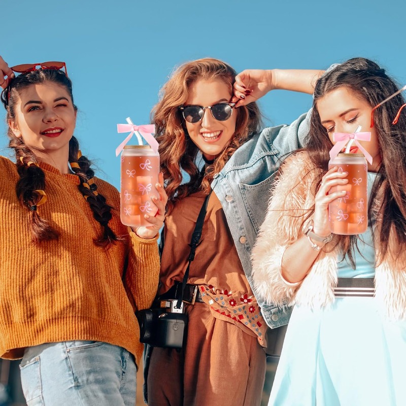 6 Sets 16oz Coquette Aesthetic Bow Glass Cup with Lids and Straws for Mom Teacher Gifts Cute Bow Glass Coffee Cups Reusable Smoothie Tumbler Decor Gifts for Women Coworkers Pink