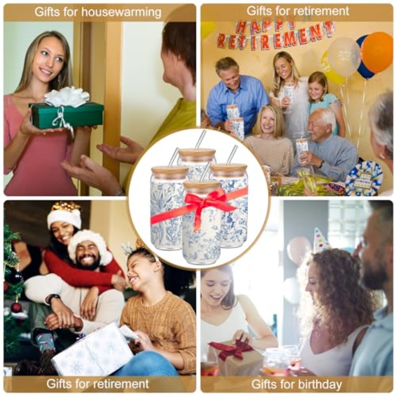 Cunhill 4 Set Glass Cups with Lids and Straws 16 oz Iced Coffee Cups with Lids Blue and White Flower Tumblers for Birthday Wedding Party Gifts Include 4 Cleaning Brushes