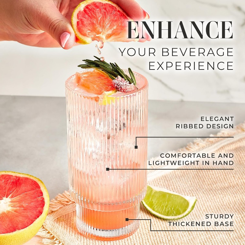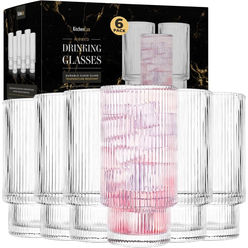 Ribbed Drinking Glasses Ribbed Glass Cups 12 oz Ribbed Glassware Set of 6 Textured Vintage Retro Ripple Aesthetic Glass Ware for Whiskey Cocktail Beer Water Coffee Bar Accessories